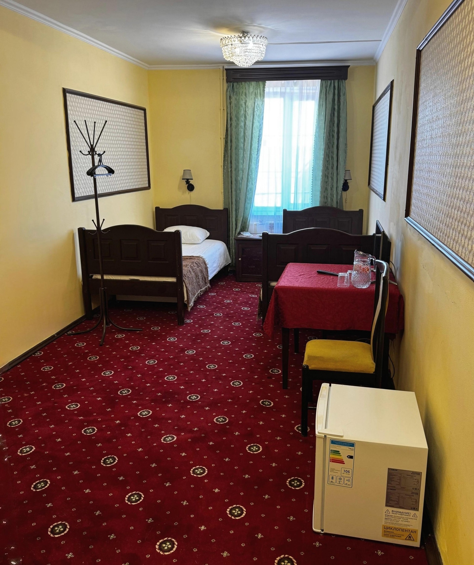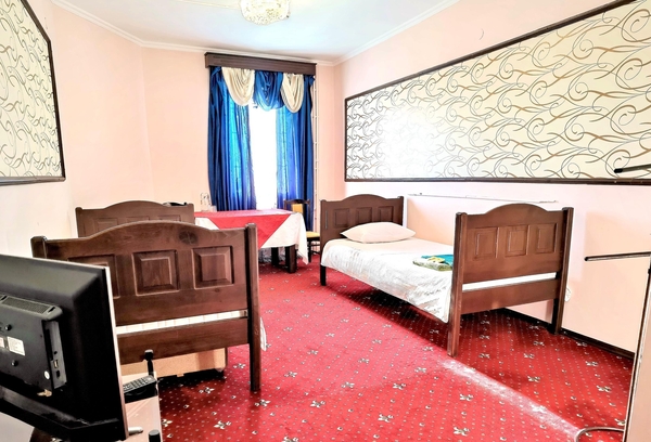 Уютные номера в спокойном стиле с двумя стандартными кроватями, прикроватными тумбочками, столом, телевизором.