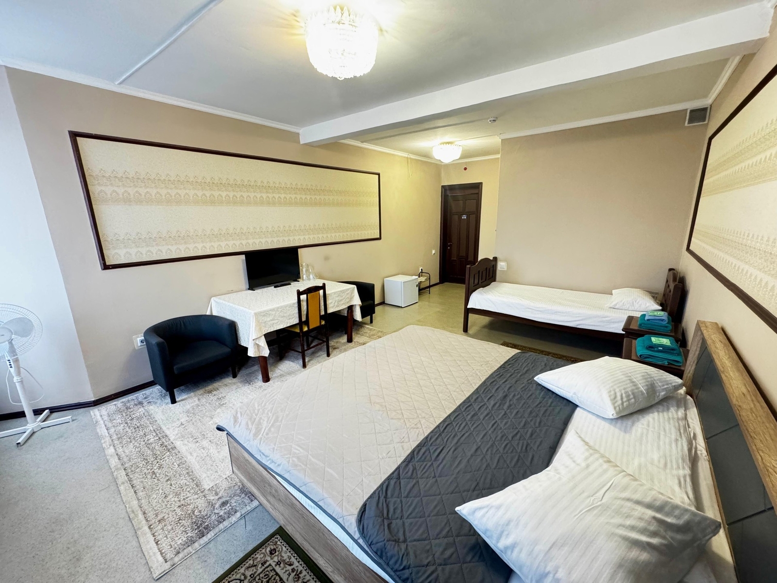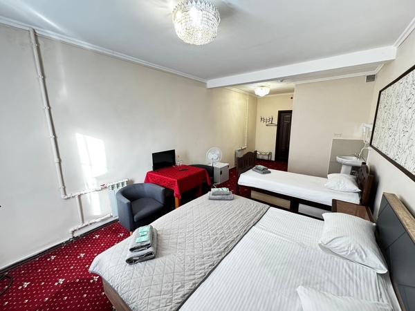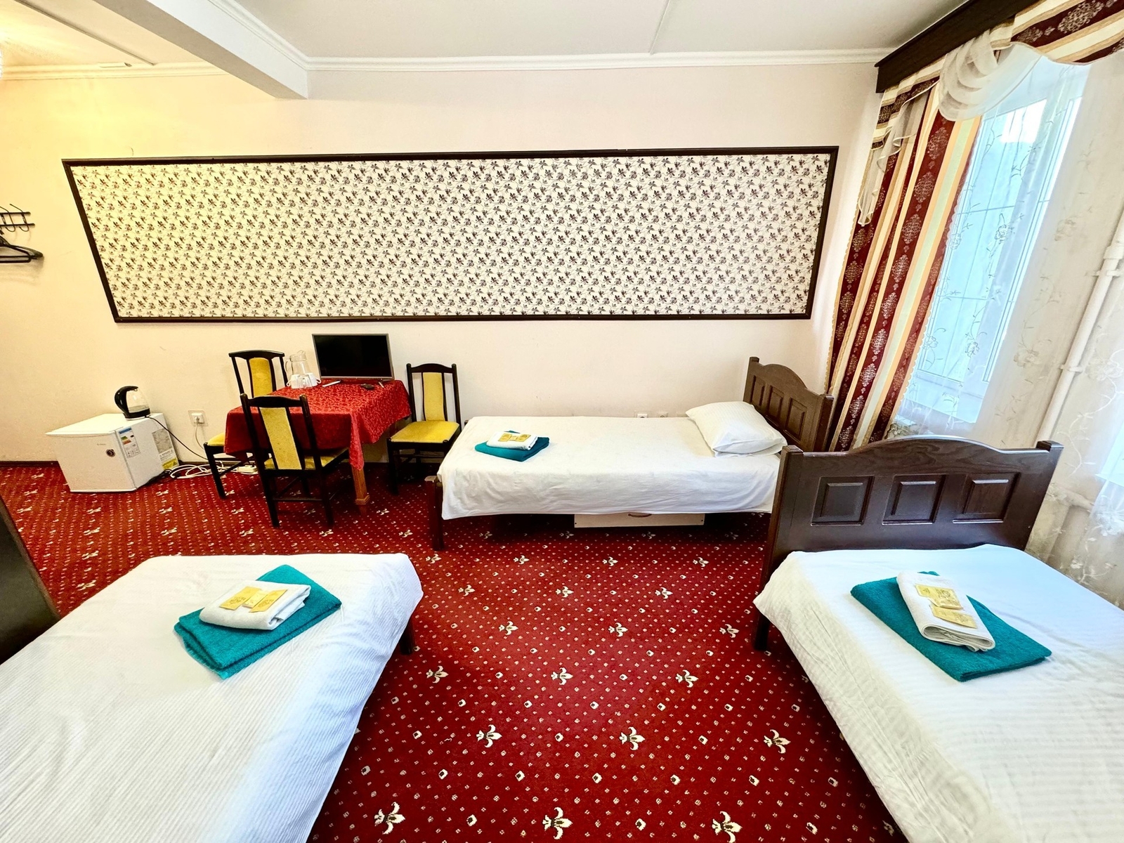 Просторные номера с тремя стандартными кроватями, прикроватными тумбочками, столом, телевизором.